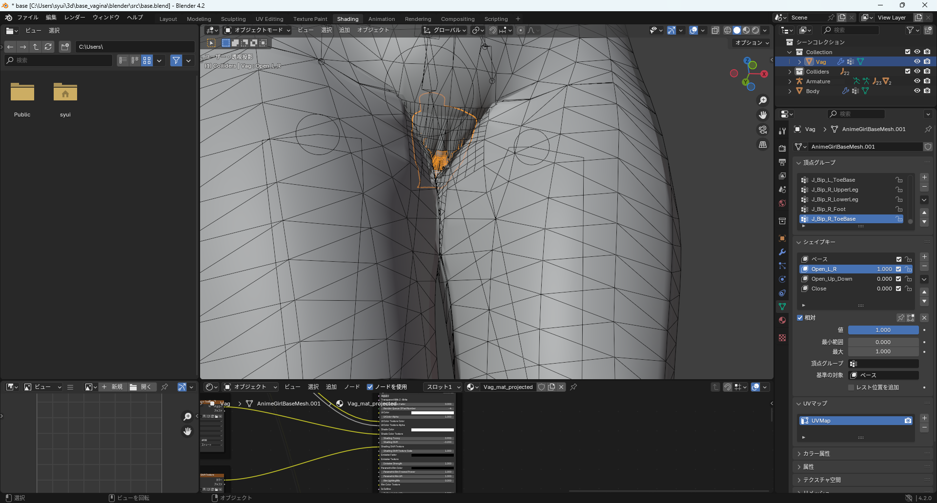 素体を作ります。できる限り現実に近い再現を目指します。これをgender systemと呼び、わかりやすくいうとキャラクターの性器システムです。なお、ここの素体はアイではありません。