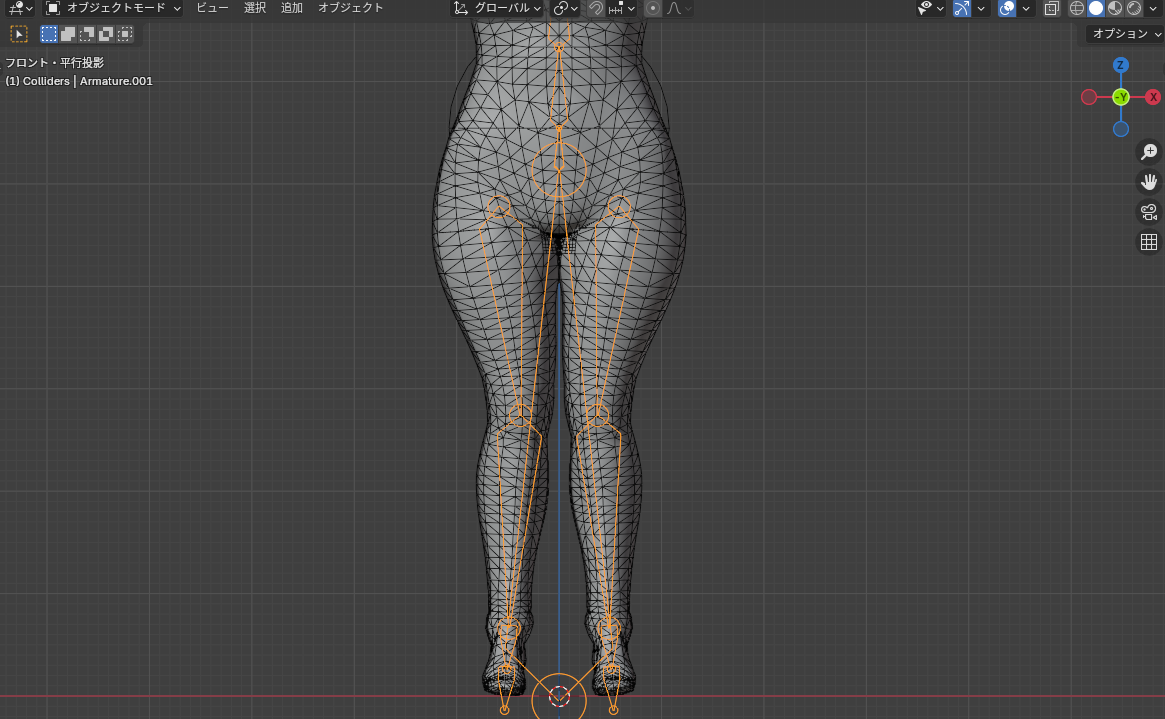 - 女性の場合はボーン(足)を調整します。なお、少し浮くようになってしまうため全体を-Zします。[G], [X], [R]