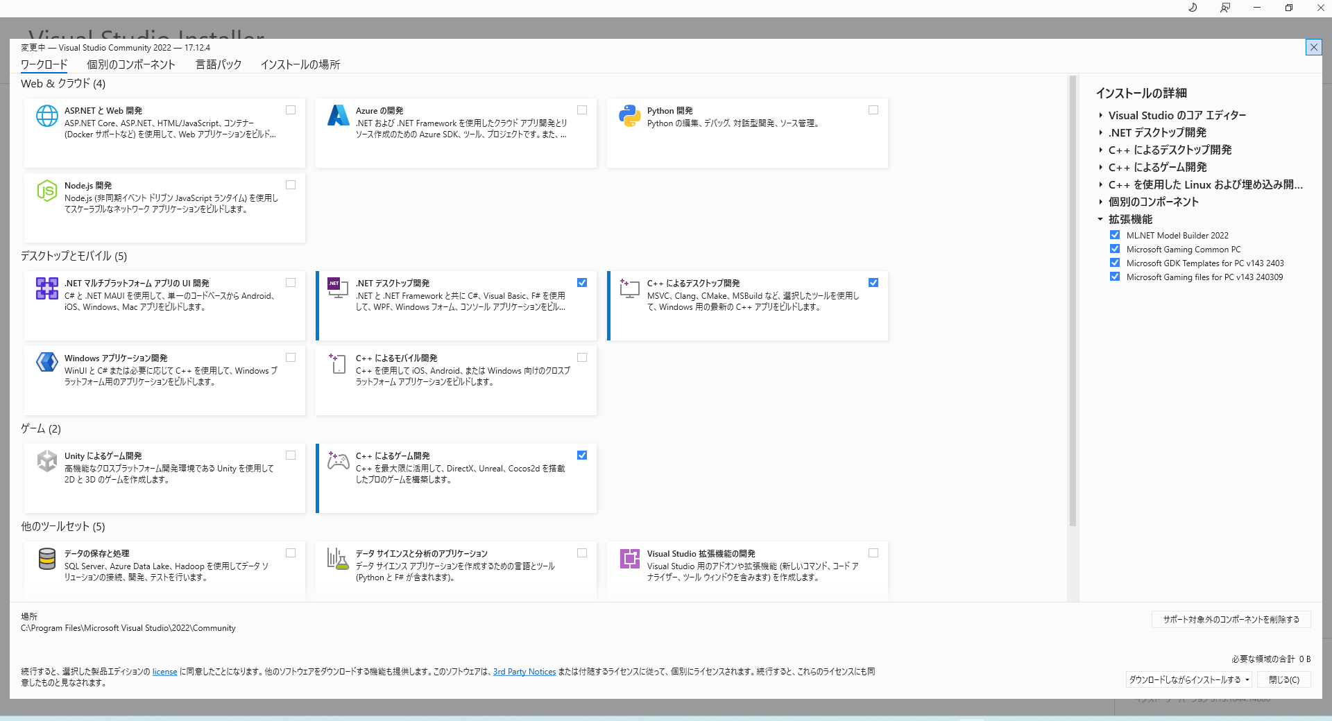また、vsinstallerを使用して必要なpackageを入れてください。