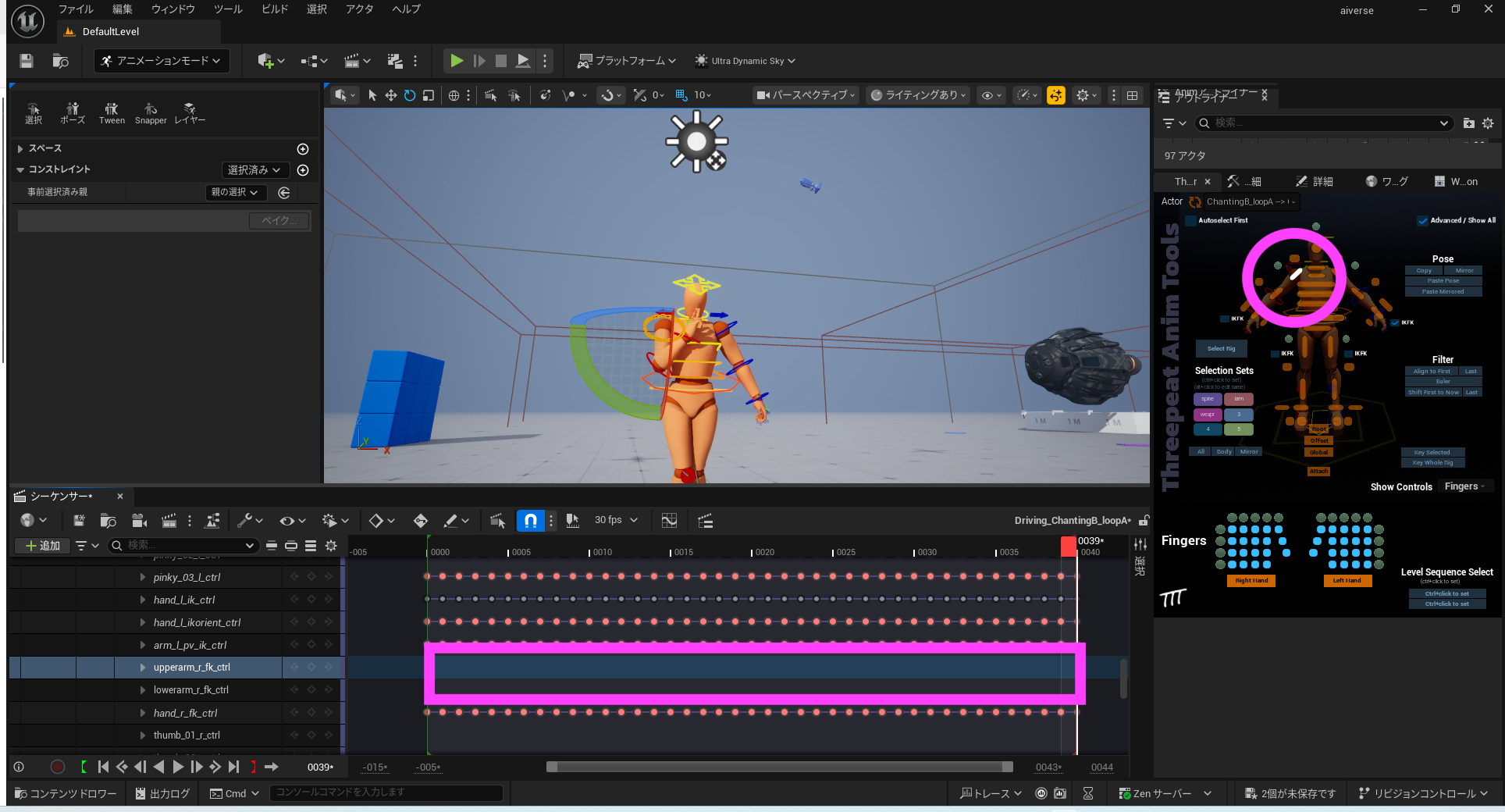 /Engine/Plugins/ThreepeatAnimTools/Picker/ThreepeatAnimTools_CR_Pickerを起動します。アウトライナーにでもウィンドウを追加しましょう。 - 修正したいアニメーション(アニメシーケンス)を開いて、